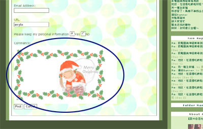 在艾瑪家看到他將留言區貼了一個很美的幸運草框框(喔!我最愛的幸運草)後,就趁做耶誕節裝飾時嘗試一下,效果沒有艾瑪好,很像貼一塊膏藥,不過dj詢問是如何做的,我就將作法分享一下。首先你當然得準備一張大小差不多的圖,愛米用的原圖有二張,都是取自素材網站,再加工調成我想要的樣子。然後我用的語法如下:.comments-body textarea {