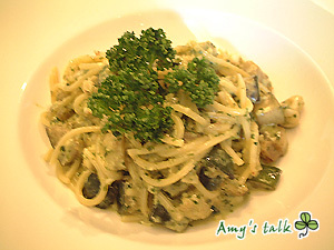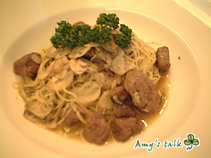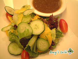 我們都點了主菜,再加100元,可以有濃湯,沙拉、甜點、麵包三選二和飲料。南瓜濃湯ㄟ,沒我煮的濃啦,不過有南瓜味,呵呵,下次就以這個為努力目標啦。麵包小啾很捧場。沙拉很新鮮,不過醬好酸喔,我沒讓他直接淋在上頭是明智的。Ariel的菲力麵,菲力好好吃,amyle的蘑菇麵也不錯,麵很Q,weiwei的鮭魚麵我已經沒有肚子分享,wei說太油啦,看起來好像是