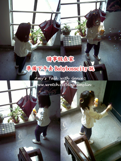 請事假為了玩的小若。媽媽工作時,一個人在樓梯間吹泡泡,自得其樂。