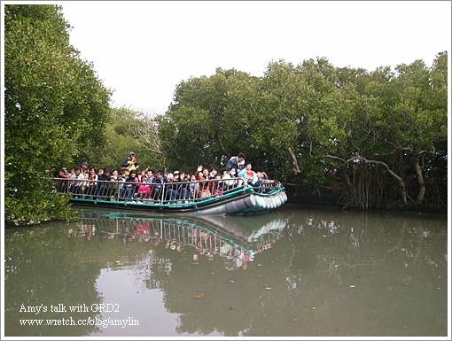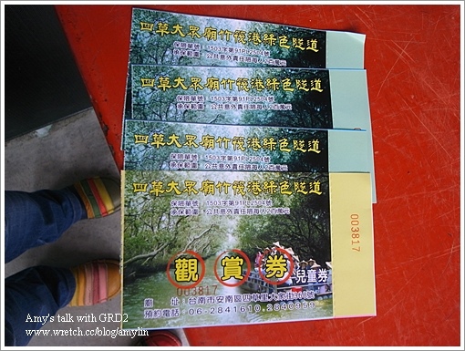 目前四草有二條搭船觀光路線,一是「搭竹筏遊綠色隧道」,航程大約30分鐘,二是搭比較大有頂棚的船進行「台江四草湖生態之旅」,航程大約75分鐘。初四這天的台南,雖然沒下雨,但也沒陽光,我們選擇時間比較短的綠色隧道之旅。生態之旅下次備妥望遠鏡再來喔。