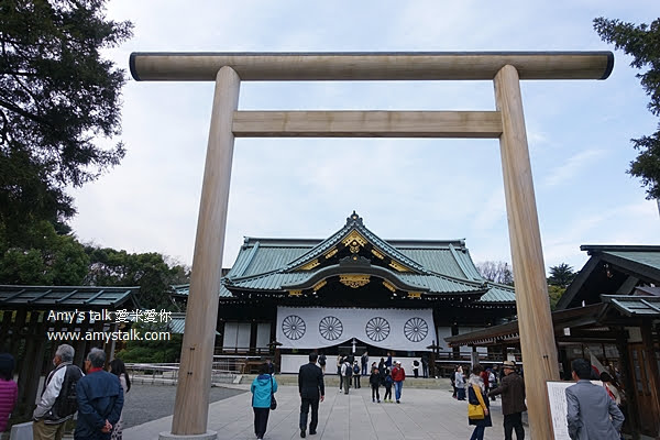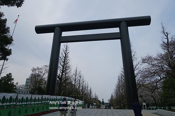 日本神社的大門叫「鳥居」,立於神社的最前方,是進入神域的入口,做為一個「結界」,分別了神界與人界。靖國神社的第一鳥居,建於1974年,鋼材建造高約25米,氣勢不凡。第一鳥居旁兩排目前光禿禿的樹木是銀杏,到了秋天這裡也是東京賞銀杏的金黃色的大道。